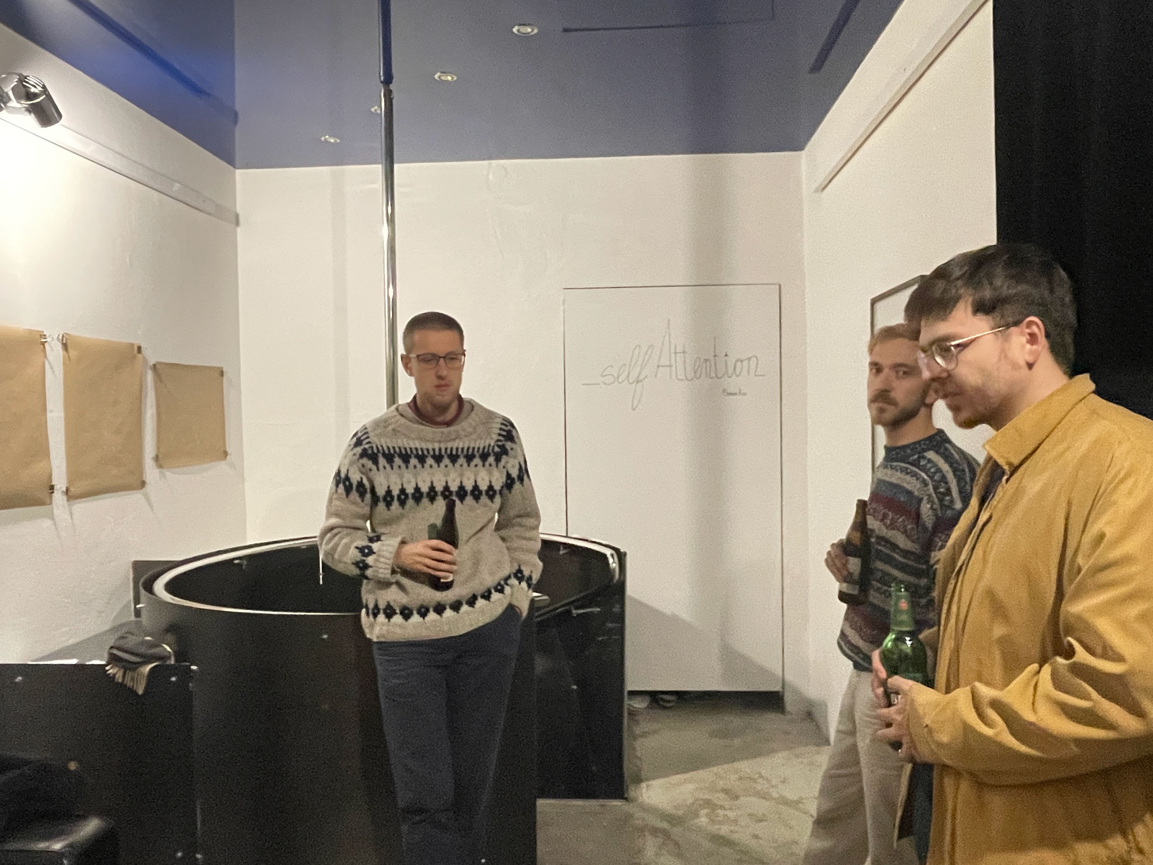 Vystavovat v galerii výstavu pojmenovanou sebepozornost je příležitost prozkoumat emoční rovinu role autorství ve spolupráci s umělou inteligencí, na pomezí spoluautorství — autorského kurátorování jejích výstupů a hledáním vhodné materiality pro abstraktní výstupy z ještě abstraktnějšího zdroje.