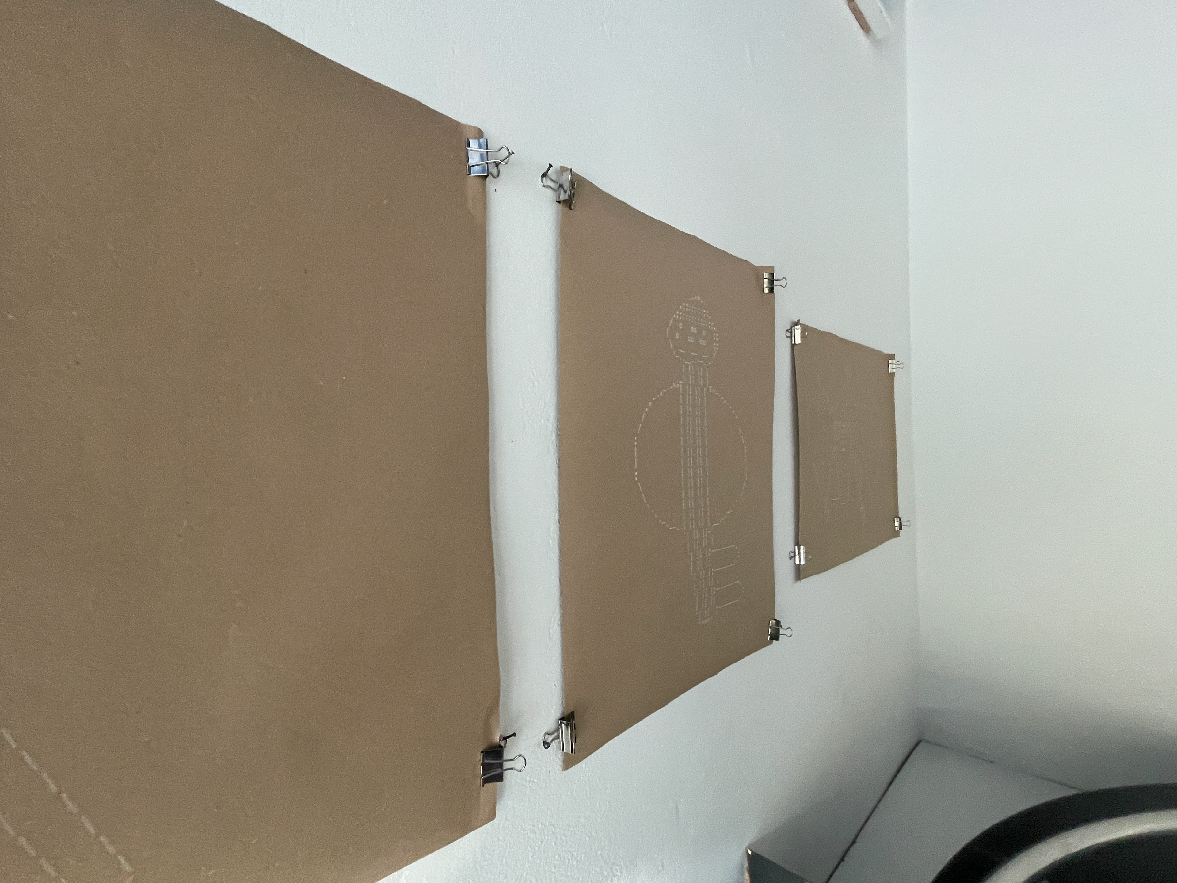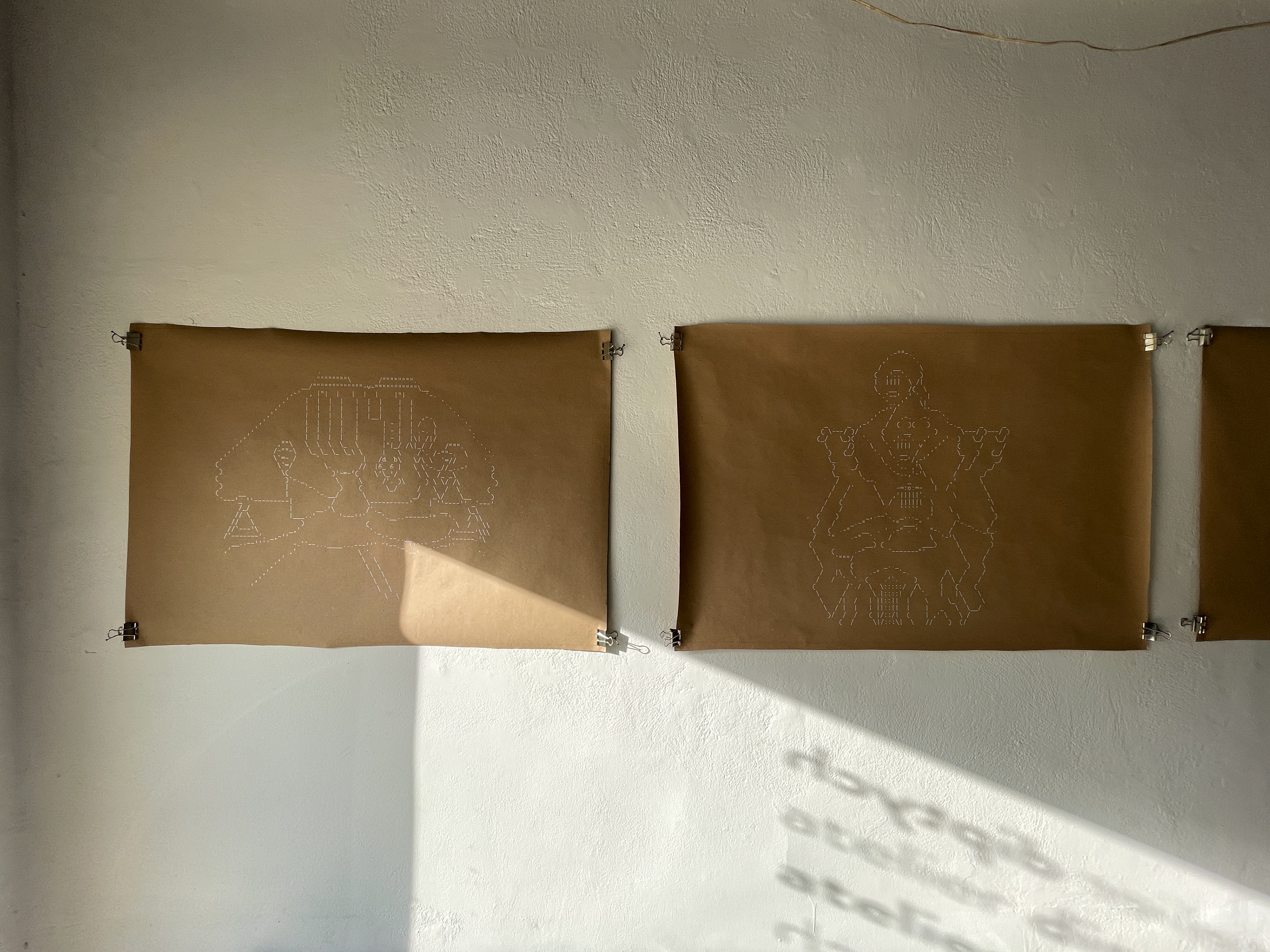 Série velkoformátových skic na baličáku je na papír přenesena pomocí DIY Ottova plotteru, dvojosého robota s perem. Plotter byl první a prvoplánovou volbou pro přenesení ASCII artu do materiální podoby a záměrně je zvolena skicoidní forma.